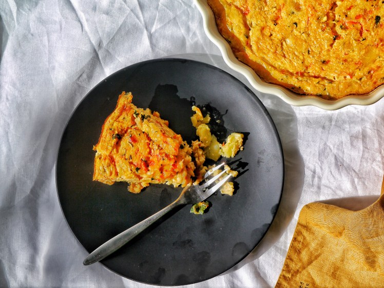 Kartoffeln in dünne Scheiben schneiden, Zwiebeln und Knoblauch schälen, fein würfeln und in etwas Gemüsebrühe bissfest garen. Zucchini grob reiben und ausdrücken. Paprika klein schneiden und mit der Zucchini und den Eiern verrühren. Die Kartoffel-Zwiebelmischung sowie das Öl dazugeben, mit Salz und Pfeffer würzen. Eine Auflaufform einfetten und die Tortillamasse hineingeben. Im vorgeheizten Backofen, bei 180 Grad ca. 30 – 40 Minuten backen.