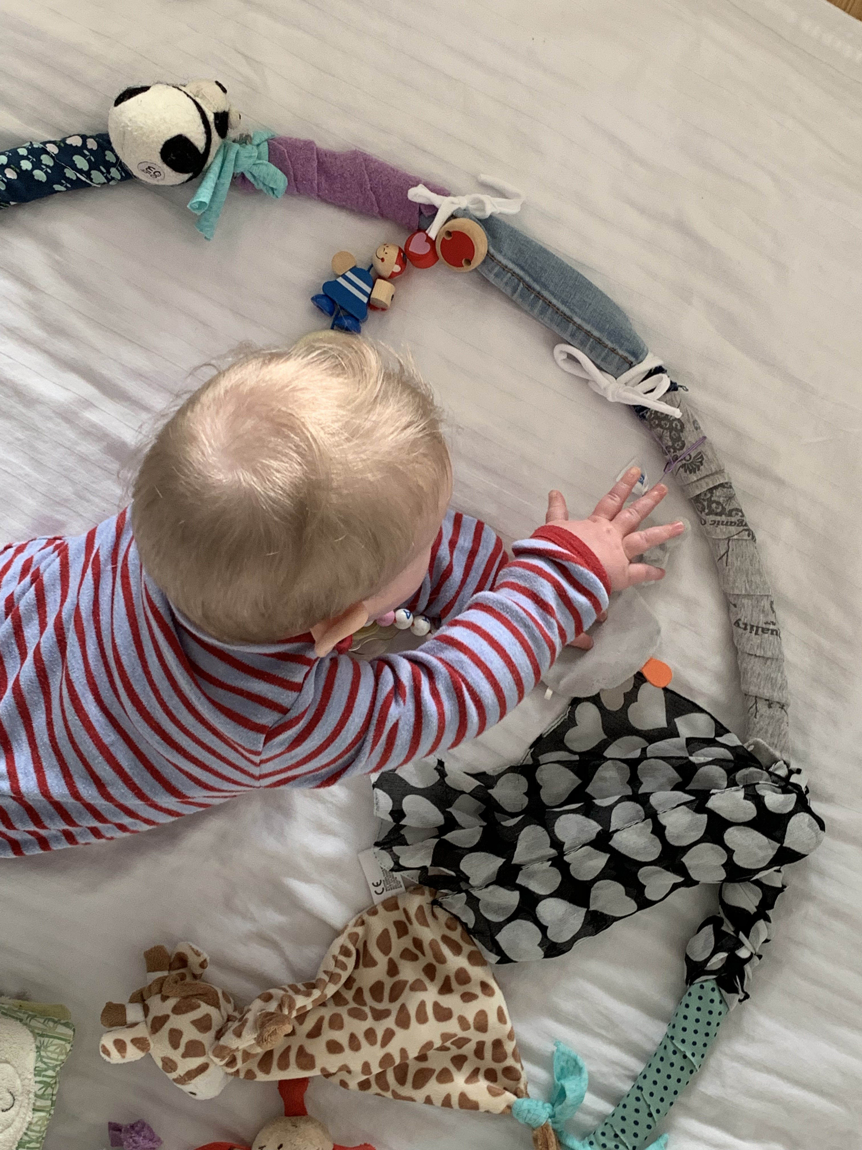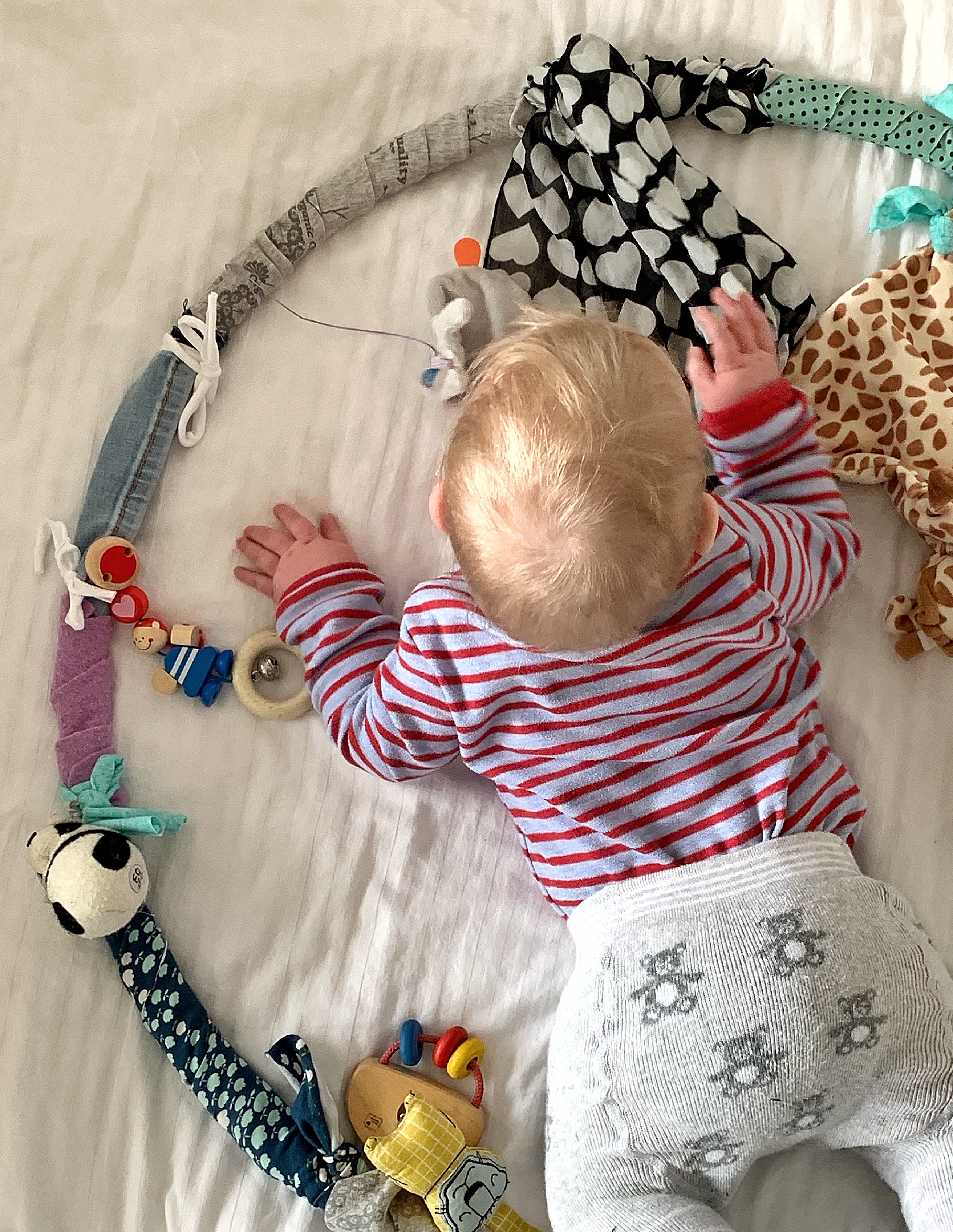 …und siehe da, von heute auf morgen fand sie die Bauchlage sogar ganz gut, da es aus der neuen Sicht viel zu entdecken gab. Um sie in ihrer motorischen Entwicklung zu unterstützen und sie gleichzeitig zu beschäftigen, habe ich diesen tollen activity Reifen gebastelt.